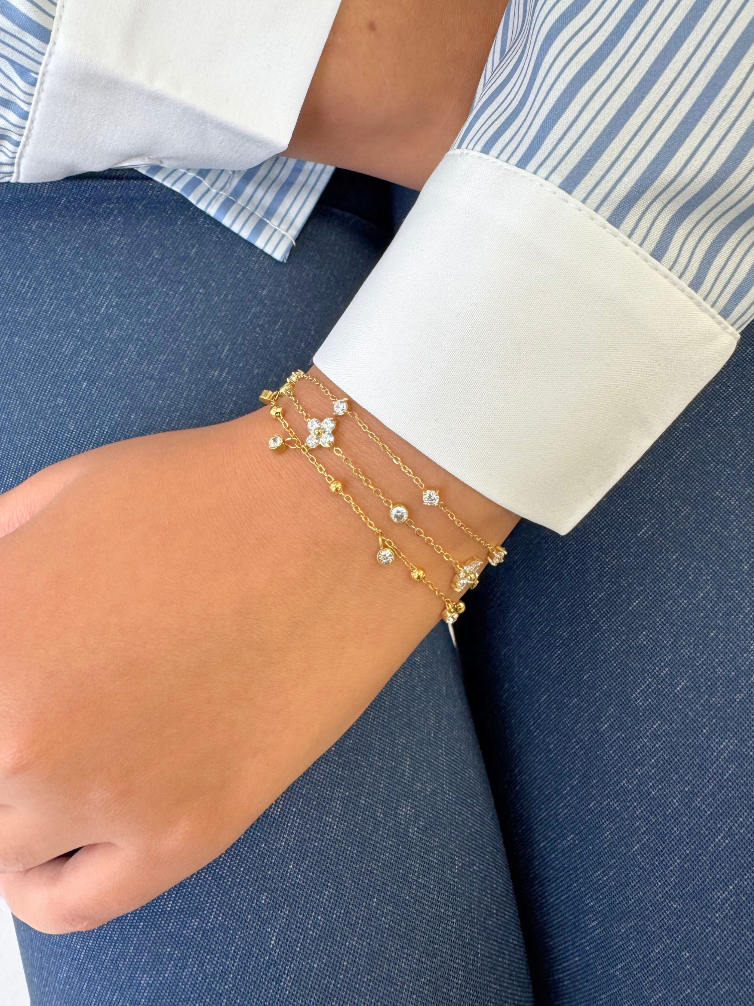 Designed to feel barely there, the Dewdrop Bracelet features three fine gold-plated chains that catch the light with every movement. Each AAA-grade zircon stone is precision-cut and thoughtfully placed to mimic the subtle glisten of morning dew - delicate, intentional, and quietly radiant.