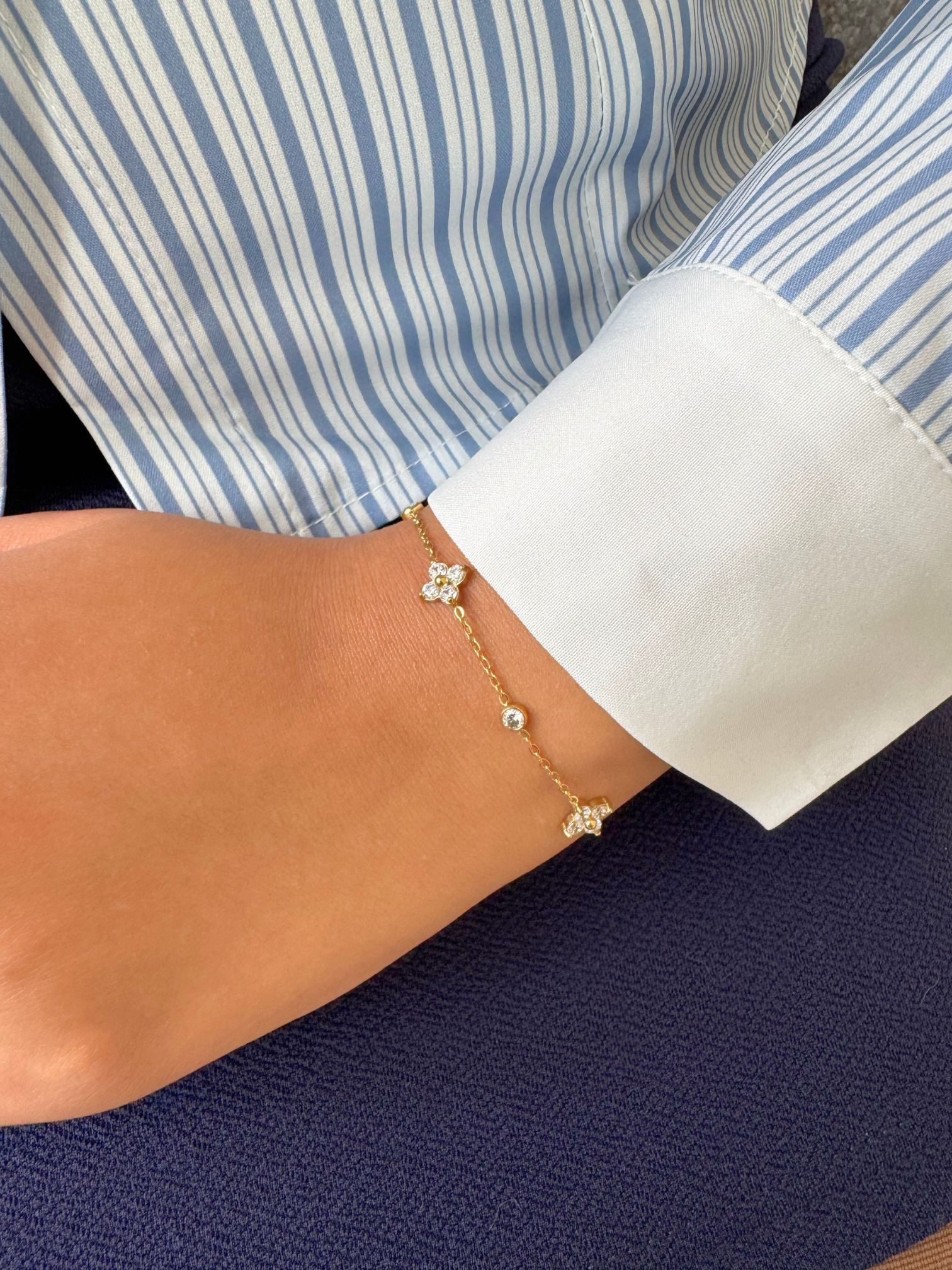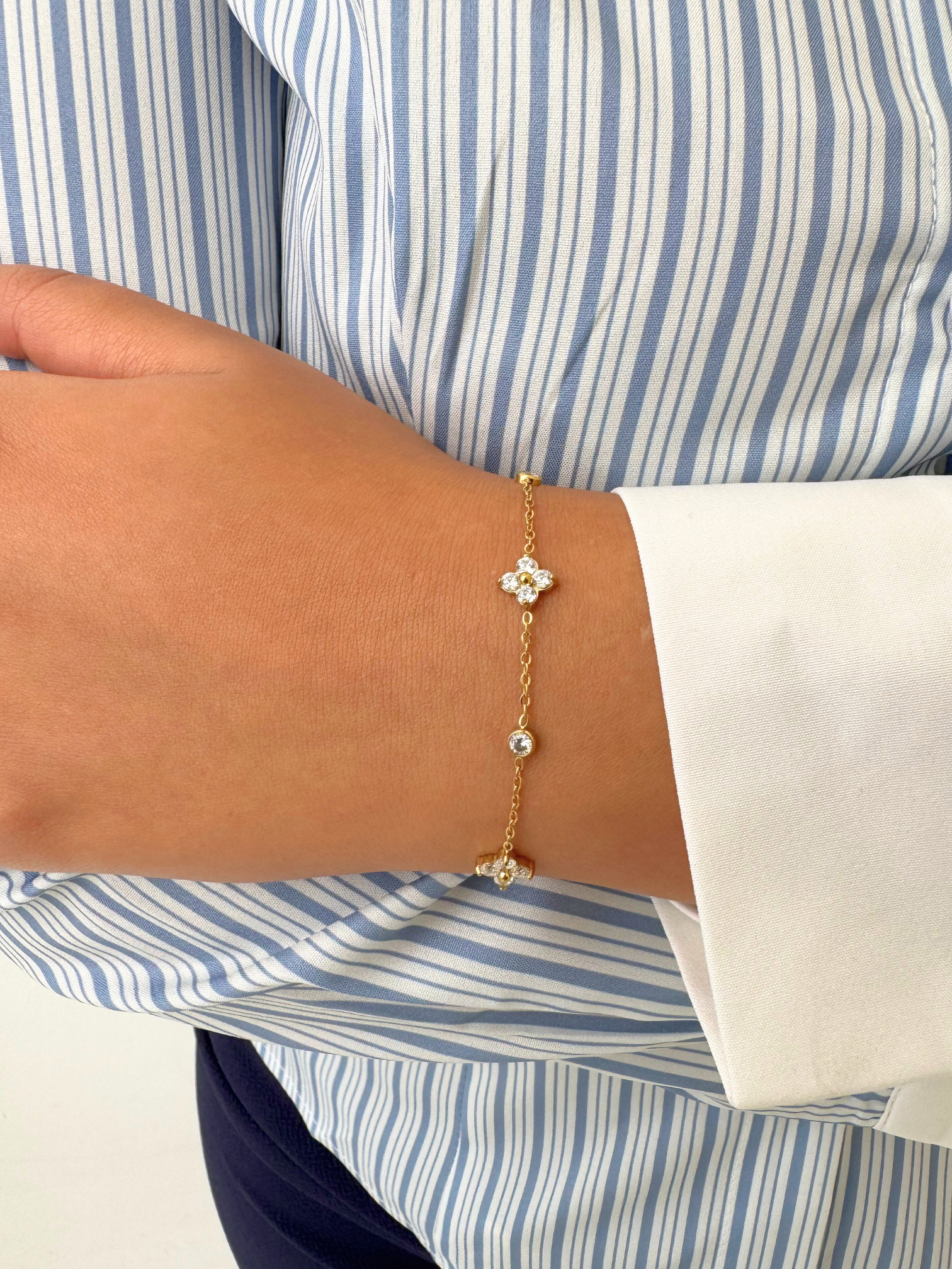 The Flutter Bracelet pairs understated glamour with wear-all-day comfort. Each zircon stone is carefully set to reflect light with a soft shimmer, while the gold PVD coating ensures lasting brilliance and resistance to everyday wear.