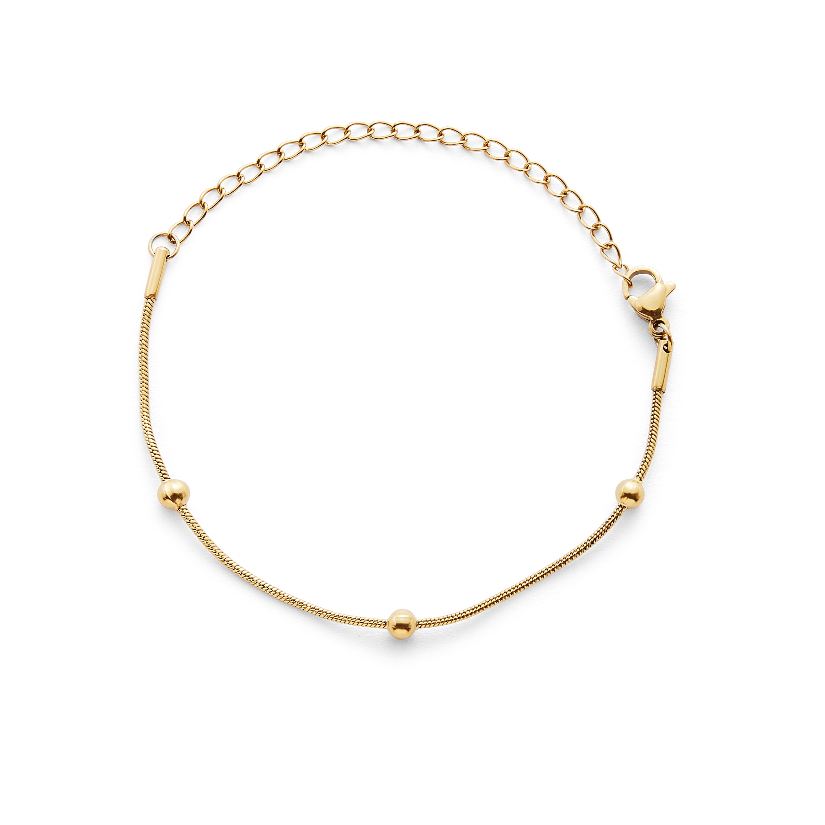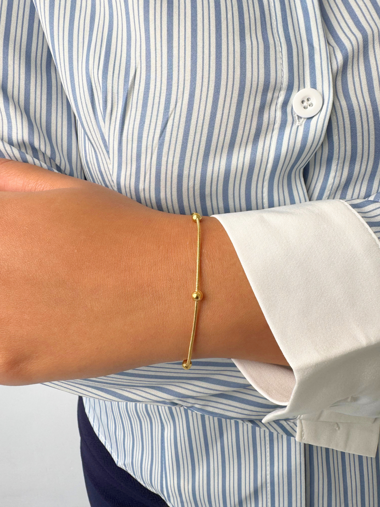A smooth snake chain detailed with orbiting gold beads - sleek, modern, and minimal.